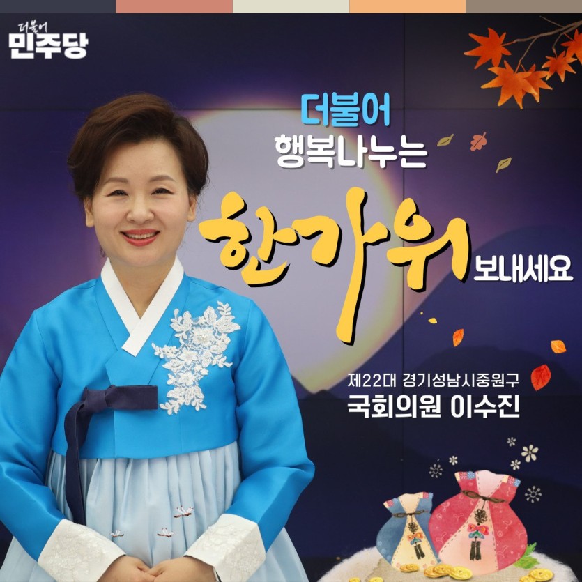더불어 행복 나누는 한가위 보내세요 chan 채기찬 조회수401 2024.09.13 더불어 행복 나누는 한가위 보내세요좋은 사람들과 따뜻한 정을 나누는 시간이길 바랍니다. 의료대란으로 국민의 걱정이 깊습니다. 국회 보건복지위원회 위원으로서 조속한 의료 정상화와 국민을 위한 의료개혁을 위해 최선을 다하겠습니다. 22대 국회의원 임기 시작 후, 57건의 법안과 결의안을 대표발의 했습니다. 특히, 이수진표 핵심 민생법안인 간호법을 대표 발의해 통과시켰습니다. 여러분의 이수진, 중원 주민과 늘 함께하겠습니다. 이수진이 뛰면 중원이 바뀝니다. 성남 중원의 새로운 도약을 만들겠습니다. https://www.facebook.com/share/p/rVh3b2e6C3N4mtfu/ 추천0 주소복사 페이스북 공유 트위터 공유 댓글 0댓글쓰기 댓글목록 등록된 댓글이 없습니다. 이전글 행복하고 즐거운 추석 보내세요 다음글 내용증명 효과와 활용 방법은? 목록 성남365 방문을 환영합니다 누적 접속자: 42,143 명 오늘 방문: 152 명 어제 방문: 174 명 현재 접속중: 6 명