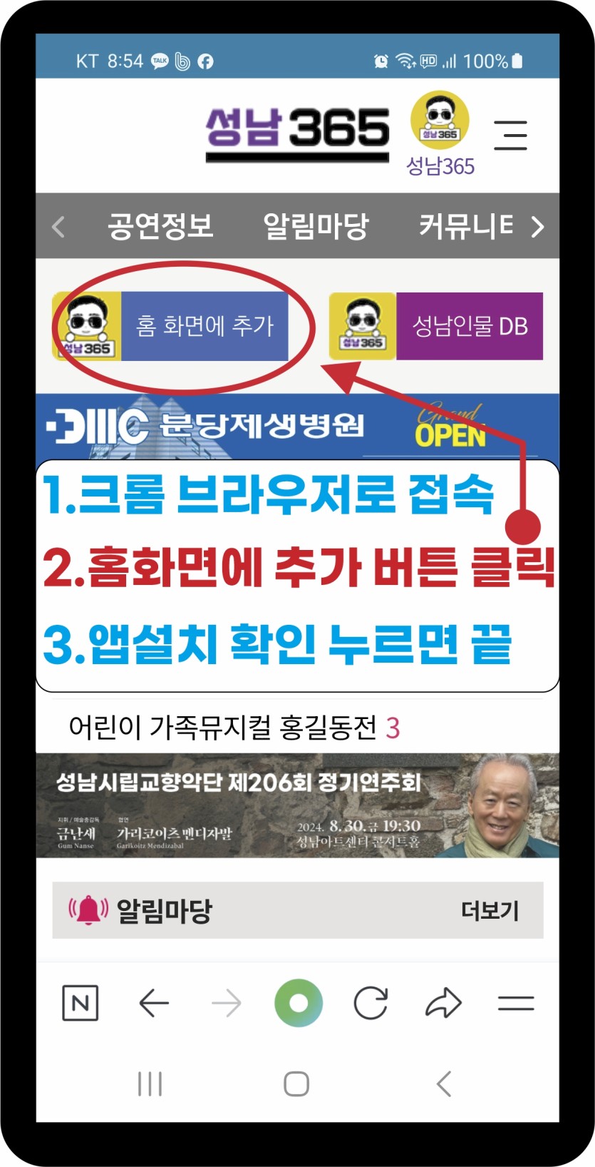 휴대폰 바탕화면에 성남365 아이콘을 생성하고 바로접속 하기 sn365 성남365 조회수498 2024.08.04 크롬 브라우저로 성남365에 접속하고 홈화면에 추가 버튼클 클릭하시면 됩니다.네이버웨일이나 아이폰 사용자는 브라우저 자체의 홈화면에 추가 기능을 이용하셔야 합니다 댓글 0댓글쓰기 댓글목록 등록된 댓글이 없습니다. 이전글 스마트폰 홈화면에 성남365 바로가기 아이콘이 생성 안될때는 다음글 성남365 포인트는 무엇인가요? 목록 성남365 방문을 환영합니다 누적 접속자: 42,143 명 오늘 방문: 152 명 어제 방문: 174 명 현재 접속중: 6 명